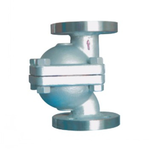 立式自由浮球式蒸汽疏水閥的結構簡單,內部只有一個精細研磨的不銹鋼空心浮球,既是浮子又是啟閉件,無易損零件,使用壽命很長。裝置剛起動時,管道內出現空氣和低溫冷凝水,雙金屬自動排空氣元件把浮球推離閥座,閥門打開,排除不凝結氣體,低溫冷凝水流進疏水閥,浮球上升,凝結水迅速排放。裝置很快提升溫度,管道內溫度上升到飽和溫度之前,雙金屬自動排空氣元件感溫變型伸直;蒸汽疏水閥進入正常運行狀況,浮球隨液位升降調節閥孔流量;當凝結水停止進入時,浮球隨介質流向逼近閥座,關閉閥門。立式自由浮球式蒸汽疏水閥的閥座總處于液位以下,形成水封,無蒸汽泄漏。